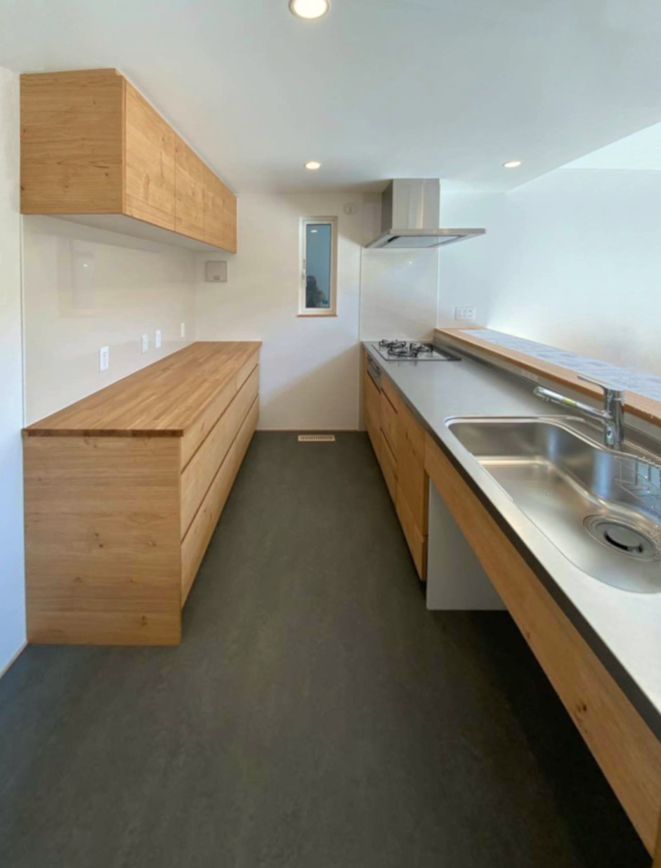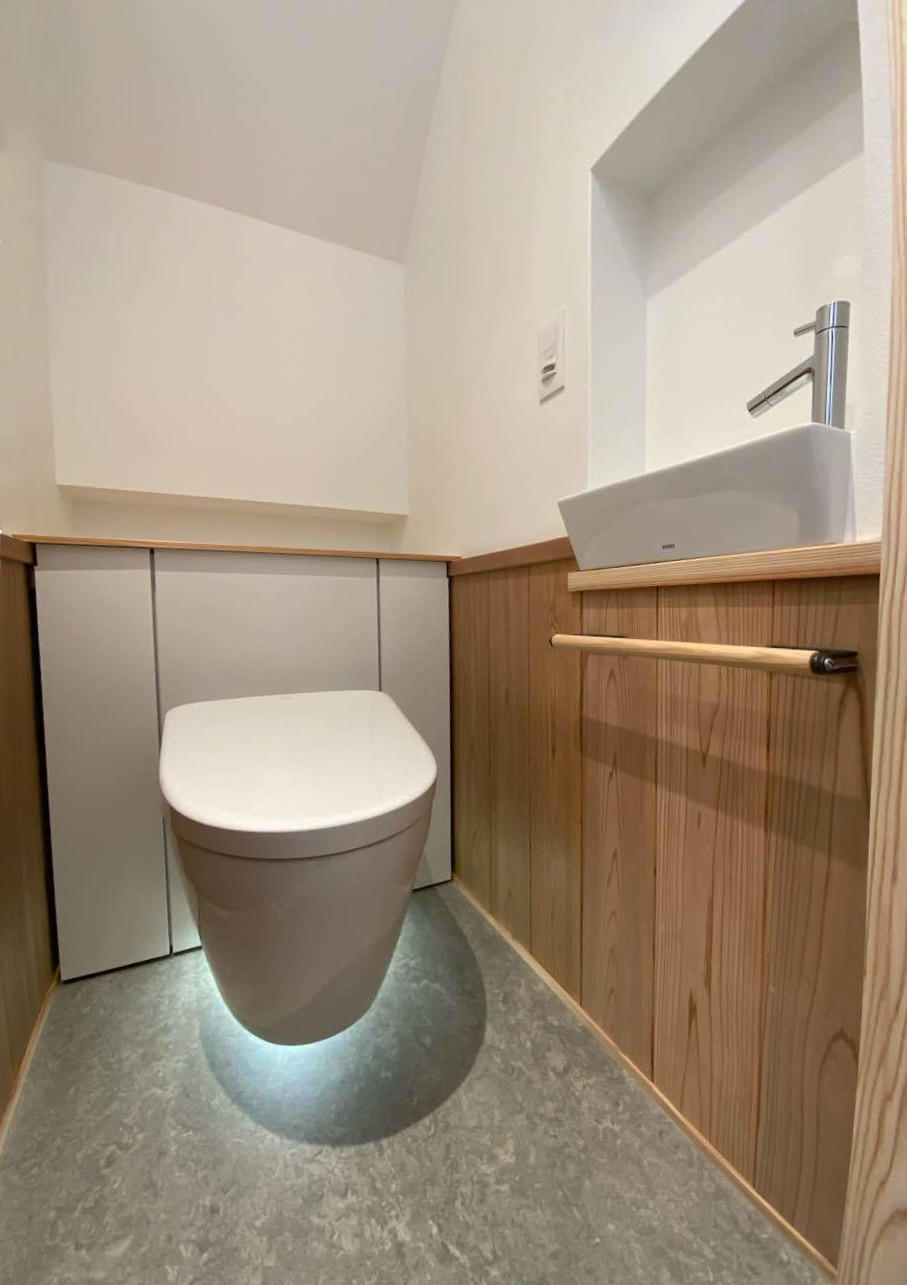 木製の扉面材を使用したナチュラルテイストあふれるセミオーダーのキッチンシステムや、洗面所のモザイクタイルやトイレの腰板張など、温かみのあるインテリアデザインが目を引きます。