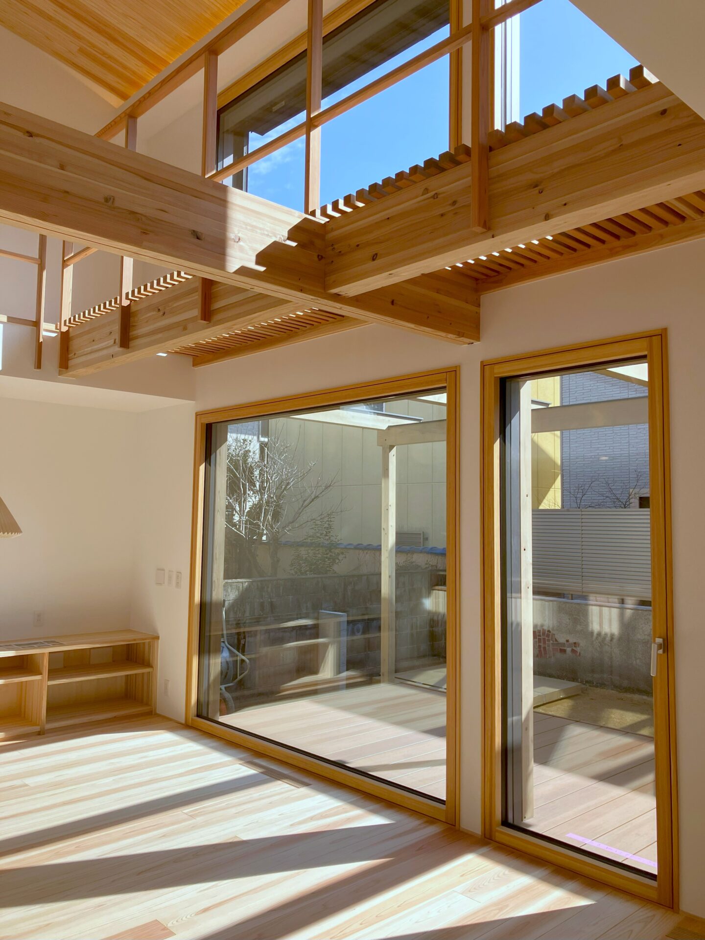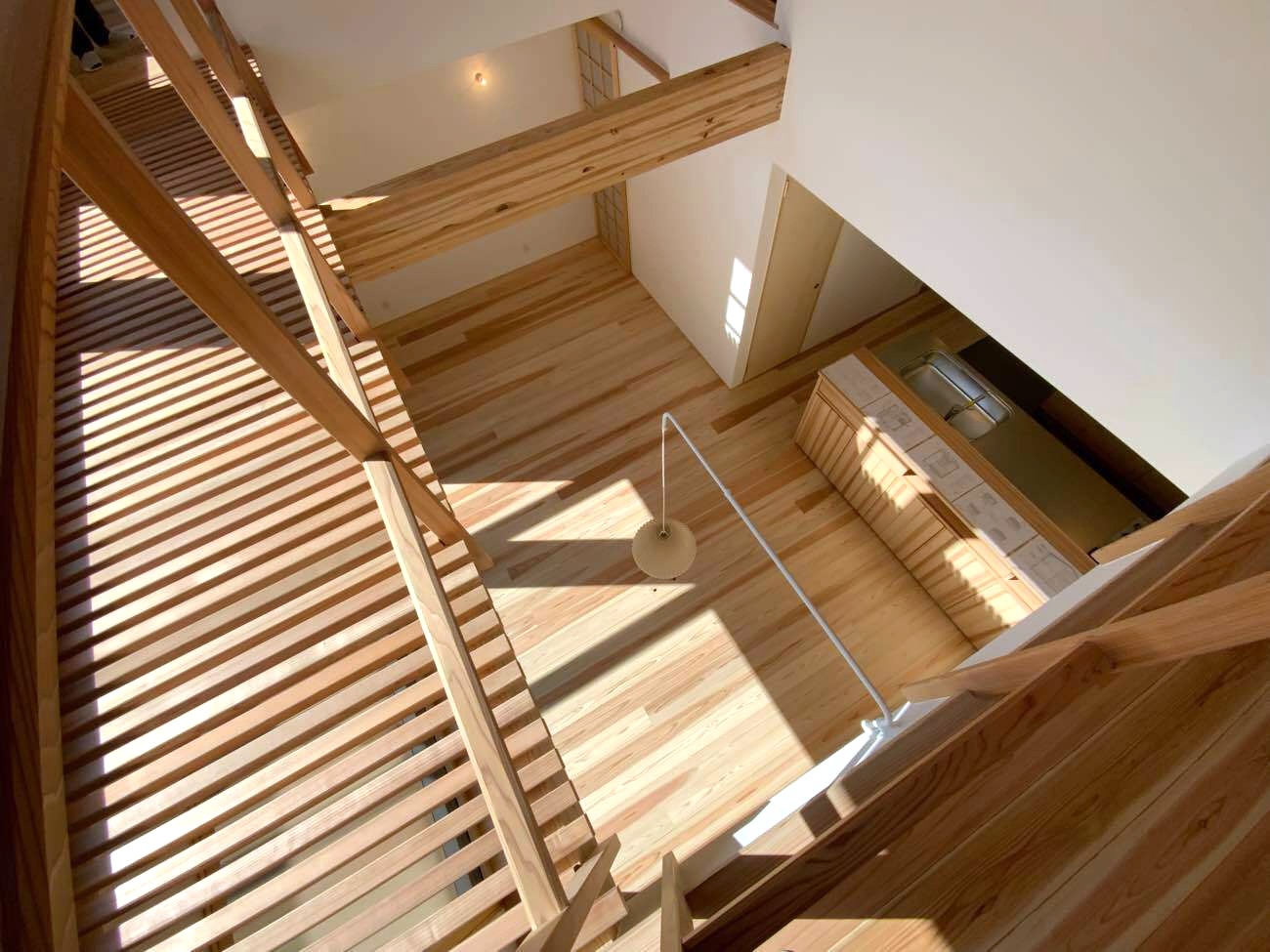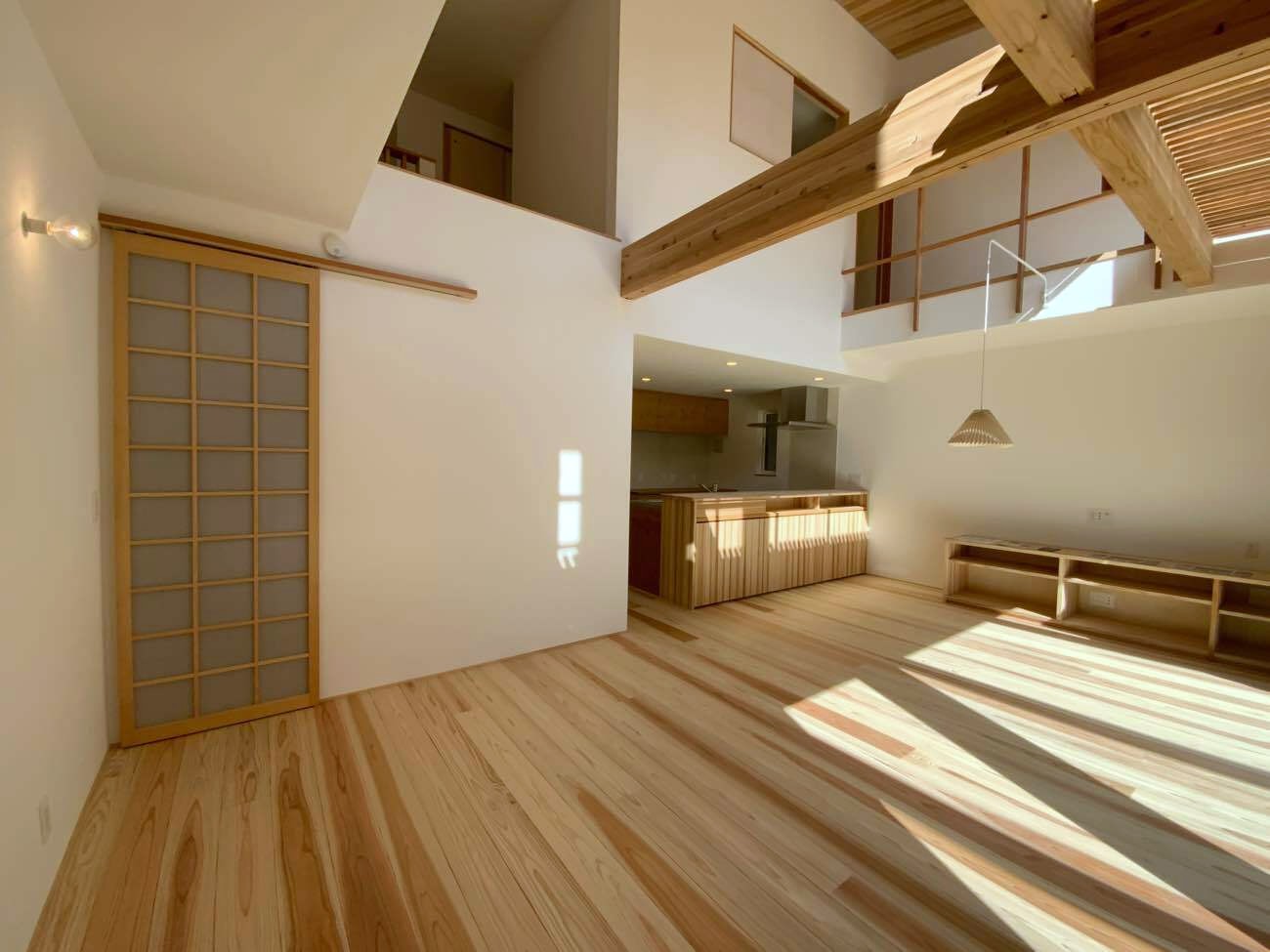 LDKは2層吹き抜けになっていて、南面の壁に設けられた大開口部には、高断熱性能で日射取得率の高い木製サッシを採用。木の温もりが感じられる内装と冬の暖かな陽ざしがふんだんに差し込む心地よい空間に仕上がっています。