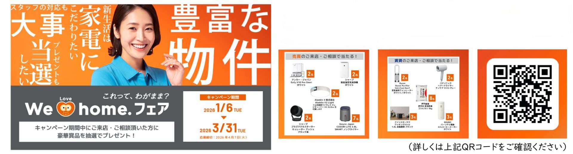 キャンペーン期間も残りわずかとなりました。 3月31日までのキャンペーン期間中に、売買のご来店・ご相談(物件見学・査定依頼 ・ご契約)されたお様と、賃貸のご来店・ご相談(物件見学・見積依頼 ・ご契約)されたお客様に、抽選で素敵なプレゼントが当たるフェアです。 ご来店いただくだけでご応募が可能です。ぜひこの機会にご活用ください。