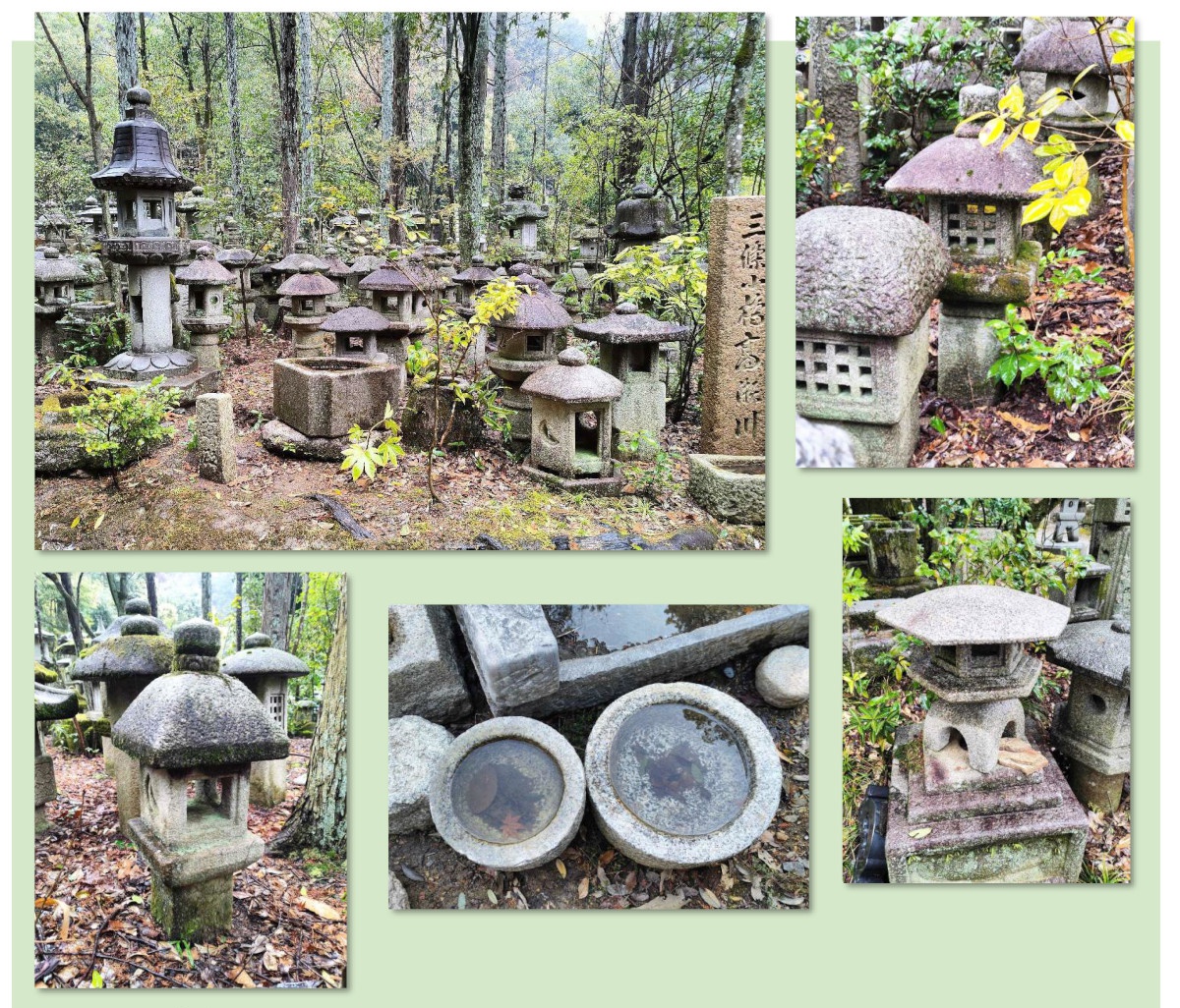 木立の中に無造作に並べられた燈籠や石製鉢の数々…。