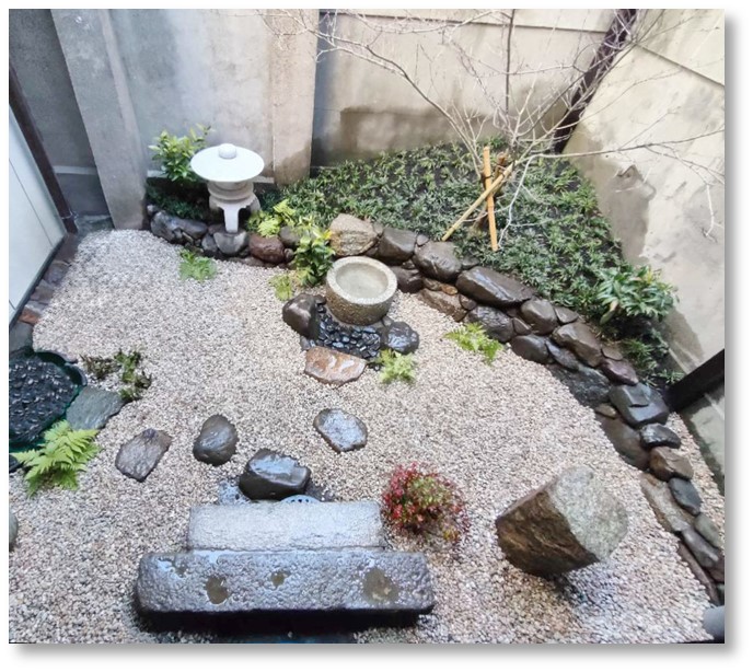 京都駅八条口から徒歩約10分の場所にある、木造2階建て、延べ面積約138㎡(約42坪)の京町家を宿泊施設と事務所にリノベーションしました。それに伴い2箇所の既存の庭をリ・デザインすることになり、前項で紹介した石材店に建築担当が足を運び、そこで見つけた手水鉢を取り入れました。創業文政元年の石材店と創業元治元年の工務店のコラボレーションが、京町家のリノベーションを通して実現する、まさに京都ならではと言えるかもしれませんね。