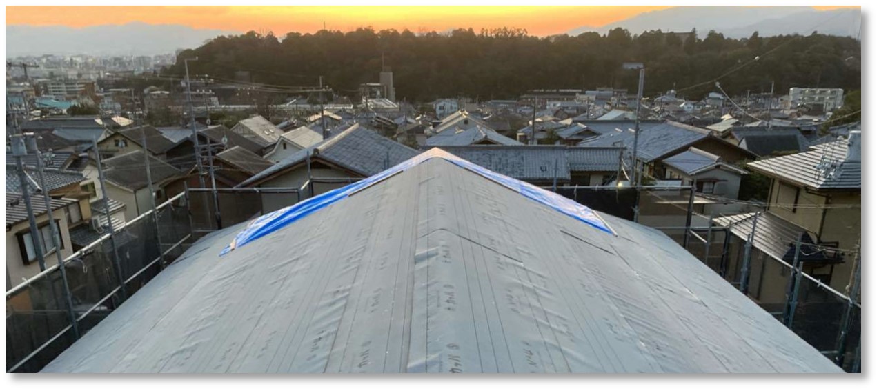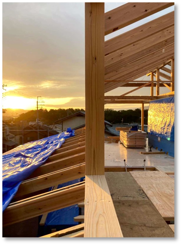 1棟目は、左京区で建築中の第一期新築工事(令和4年10月~)。 敷地面積約800㎡(約240坪)の土地に、一期工事では木造2階建て、延べ面積約310㎡(約94坪)、目標UA値※0.26の建物を新築中。(二期工事では木造平屋建ての建物を計画予定) 計画地は、西に吉田山や京都市街を望む高台に位置し、美しい夕焼けも楽しめる立地条件。庭の緑を眺めながらゆったりと寛ぐことのできる、開放感のある間取りが特徴です。