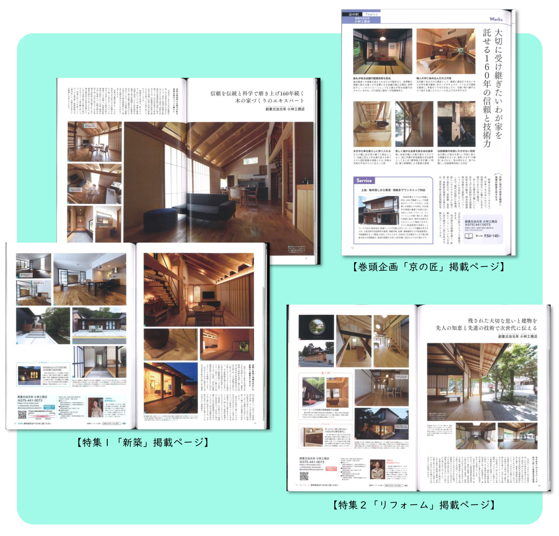 本誌には、京都で活躍する工務店や設計事務所などの情報が満載で、それぞれの特色や特長、個性あふれる施工事例などを、美しい写真とともに紹介されています。申込無料でご請求いただけますので、お知り合いの方で新築やリフォームを検討中の方がいらっしゃいましたら、ぜひご紹介ください。