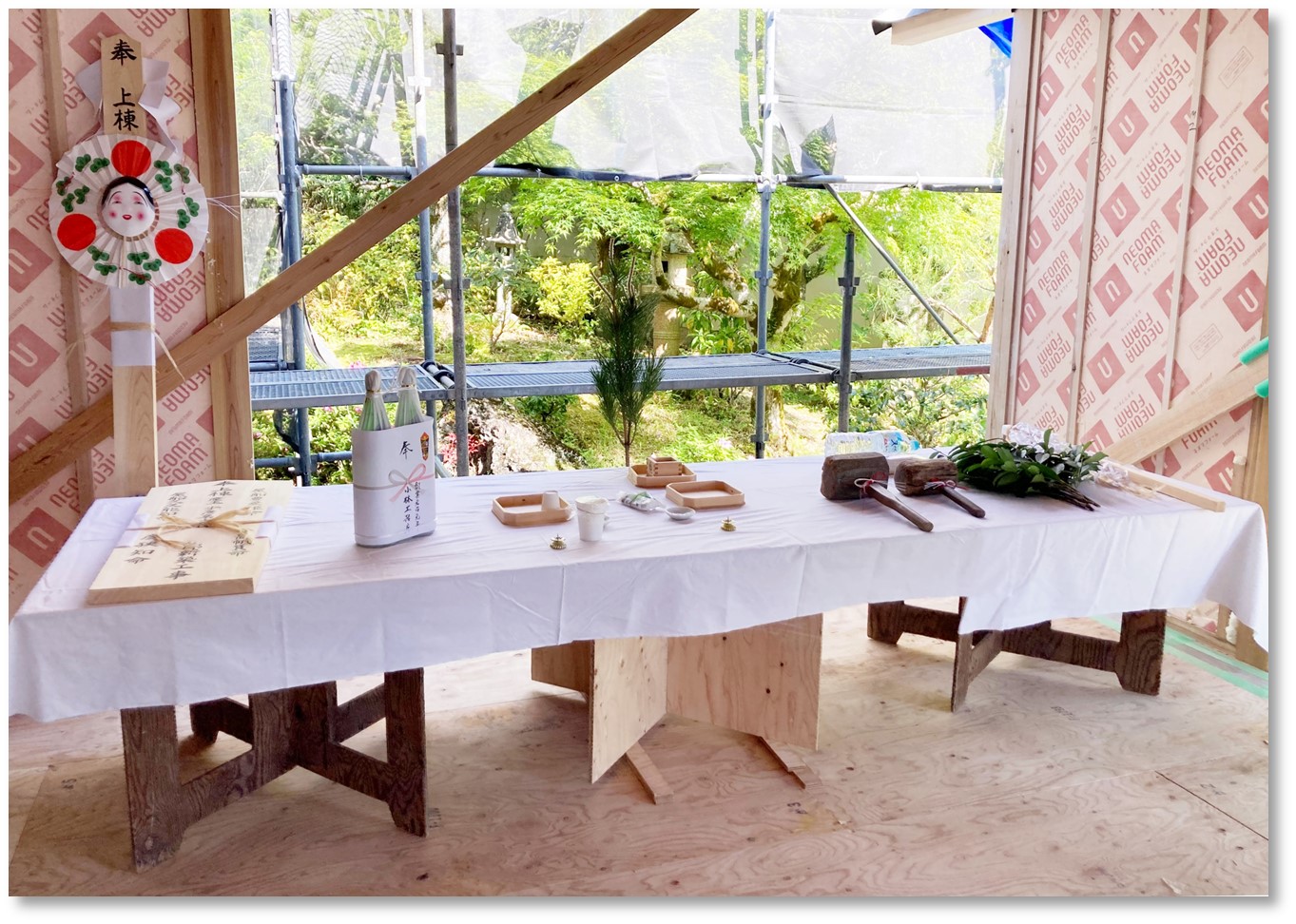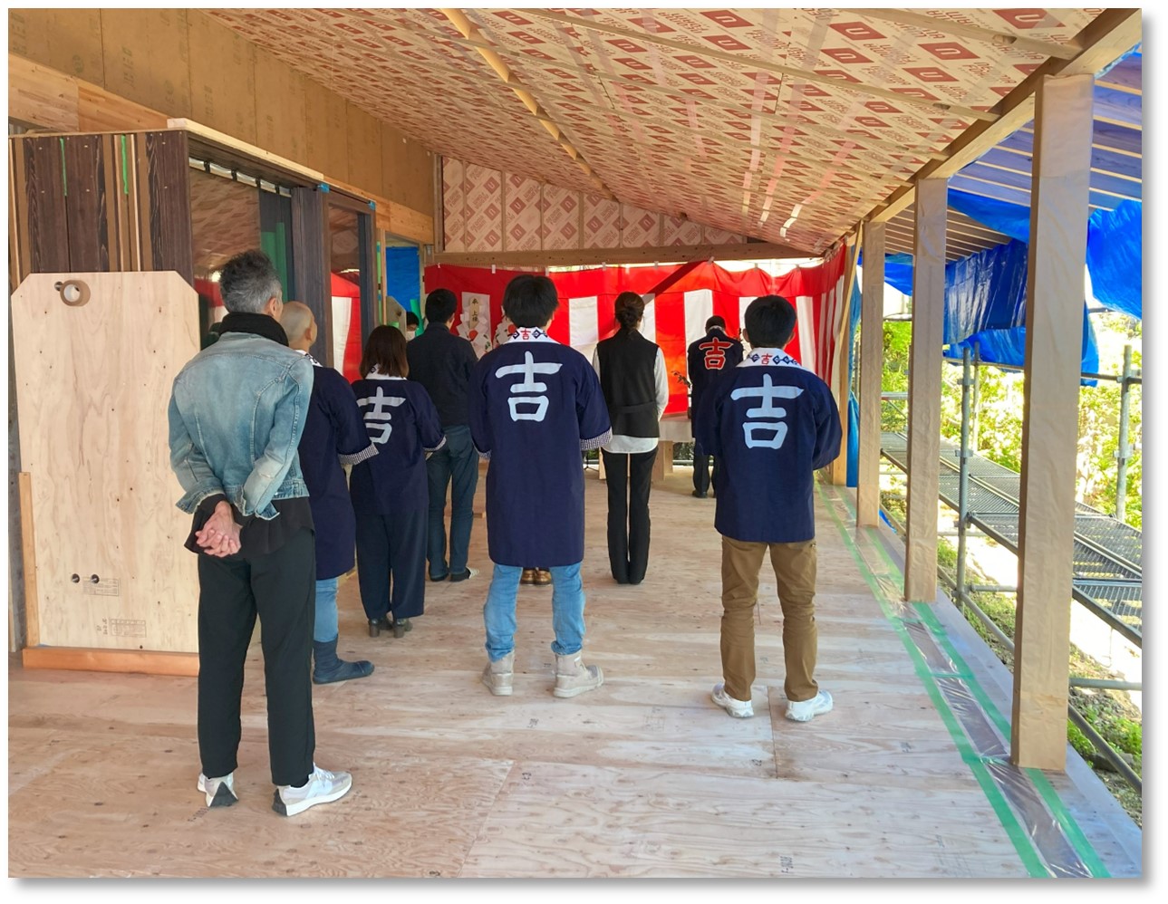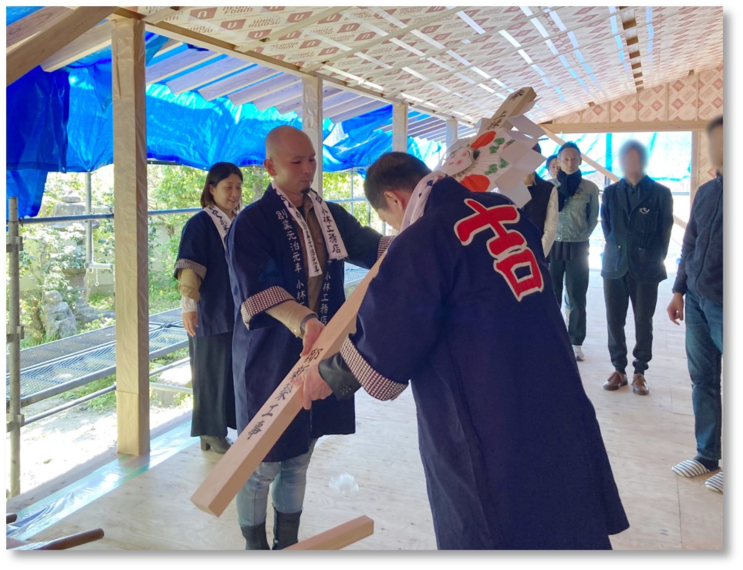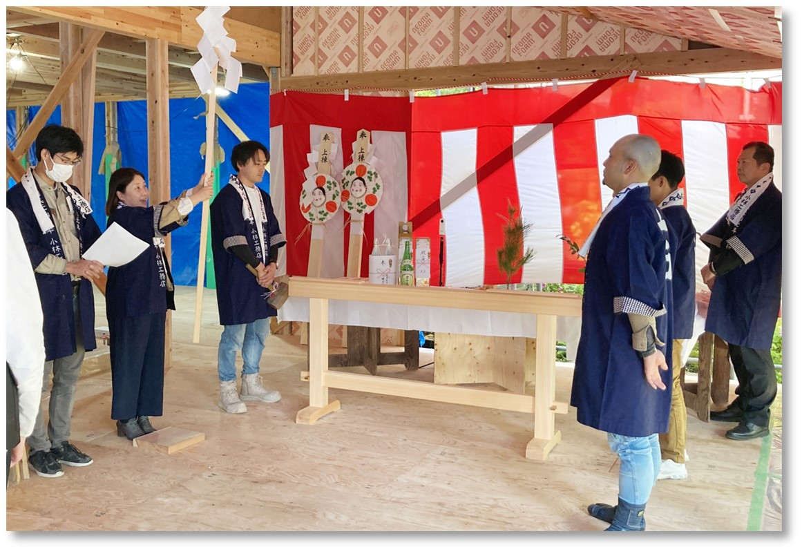 当日は好天に恵まれ、大工と建築主、設計者、工事関係者一同が参列。無事に棟が上がったことを産土神(うぶすなのかみ)に感謝し、その後に行われた直会(なおらい)をもって滞りなく神事を納めることができました。 (直会とは、神事の際に、祭神にお供えした神酒(みき)や神饌(みけ)をいただくこと。それにより、神の御稜威(みいづ)をわけていただき、加護が受けられるとされています。)