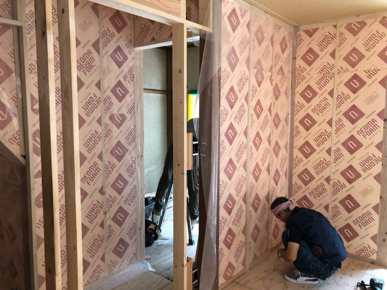中京区で進行中の断熱改修工事では、ビルトインガレージを含む建物の1階部分を全面的に居室に改修中。床・壁・天井への断熱材の設置や内窓の取り付けにより、断熱性能の向上が図られています。